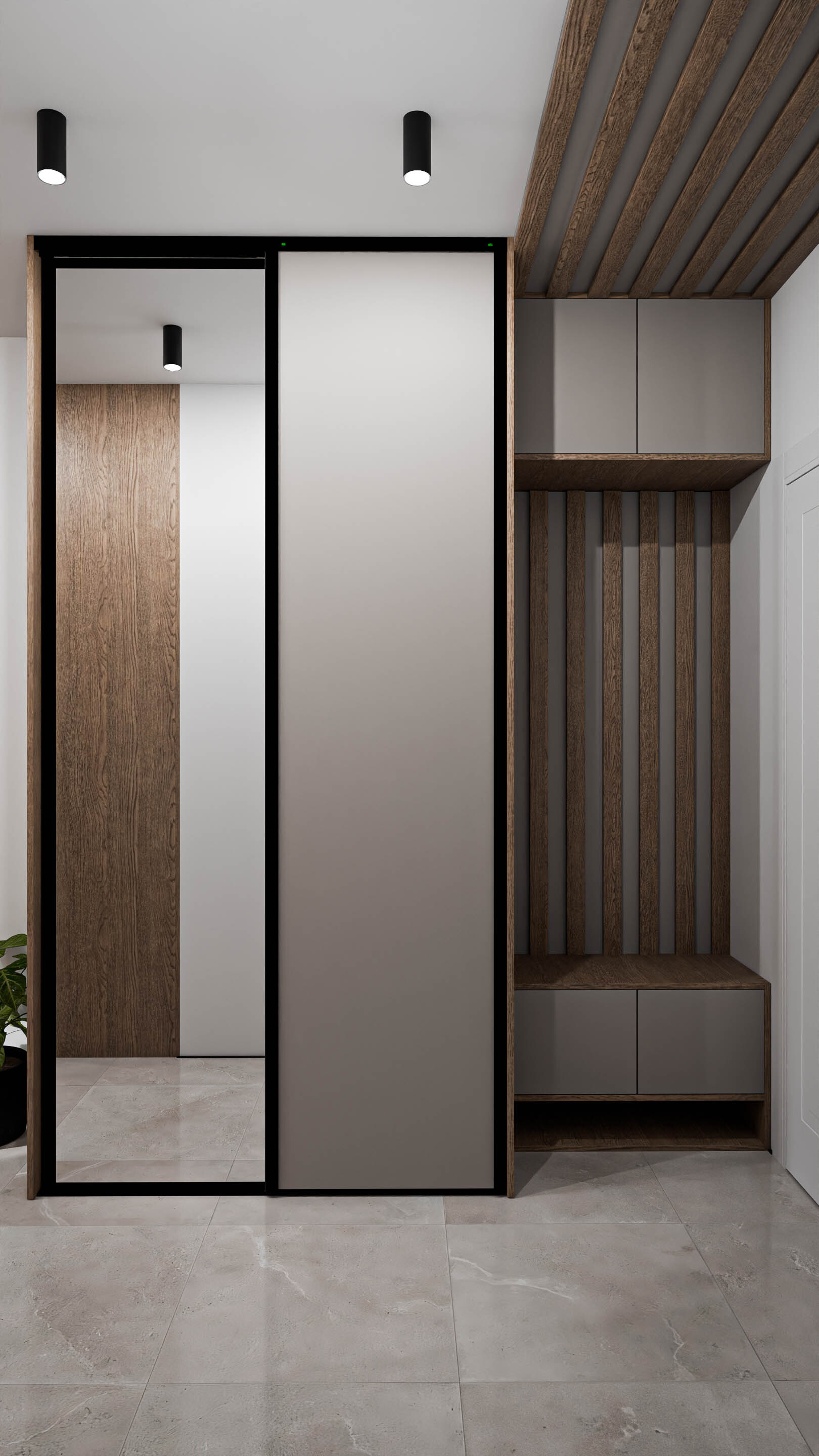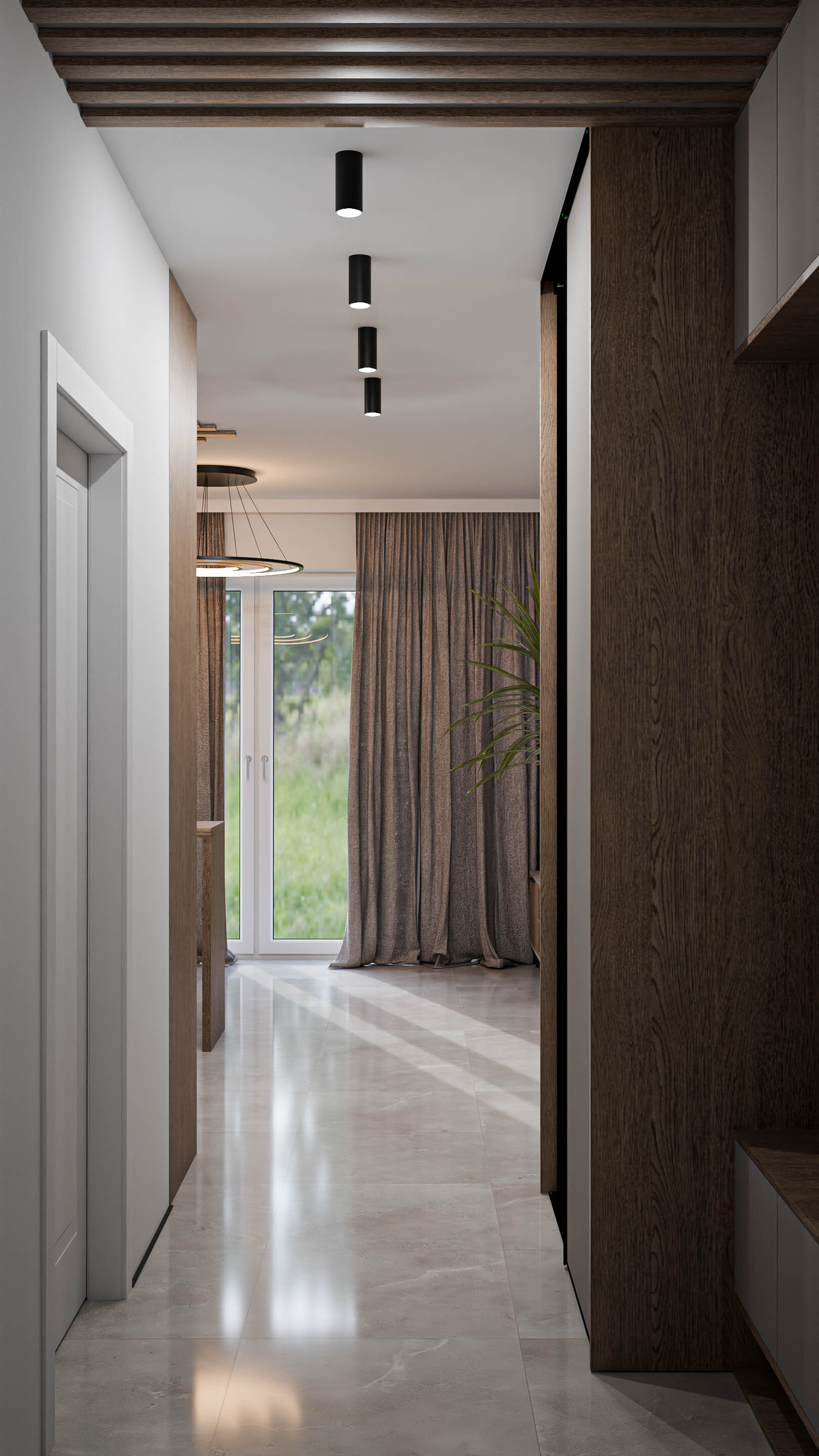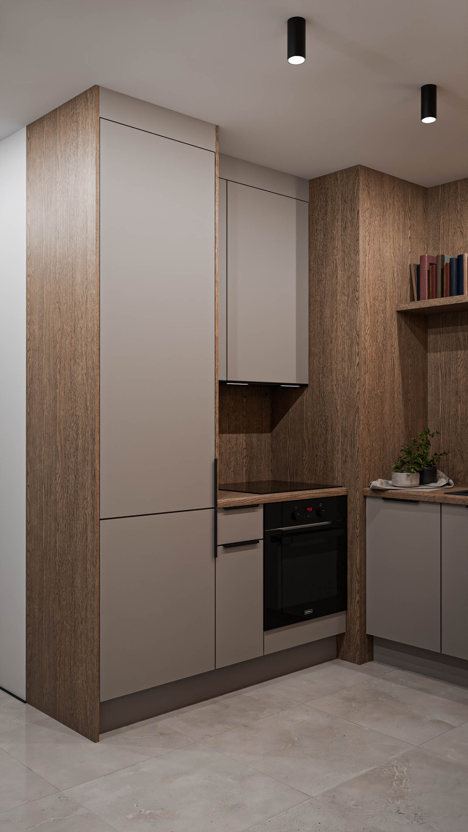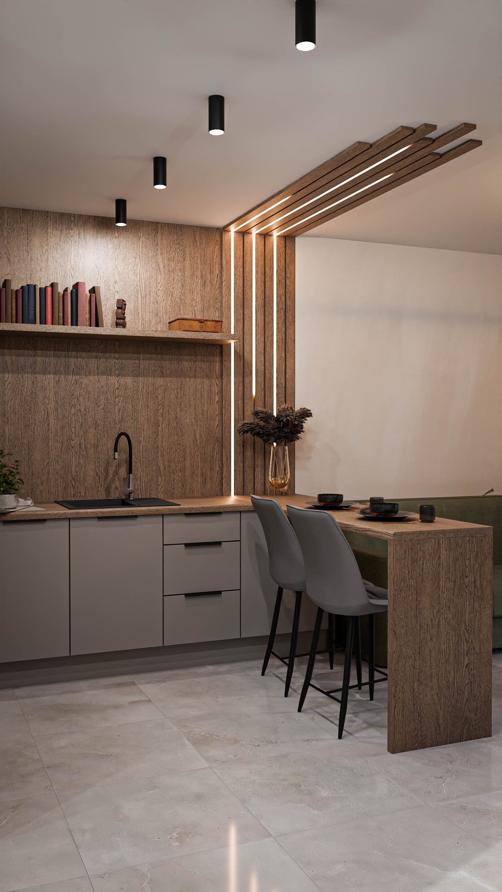 Projekt przedstawia kompaktowe wnętrze, w którym ciepłe drewno, stonowane beże i zgaszona zieleń tworzą harmonijną, przytulną przestrzeń. Kuchnia płynnie łączy się z częścią dzienną, a naturalne materiały zestawiono tu z nowoczesnym oświetleniem liniowym i prostą formą mebli.