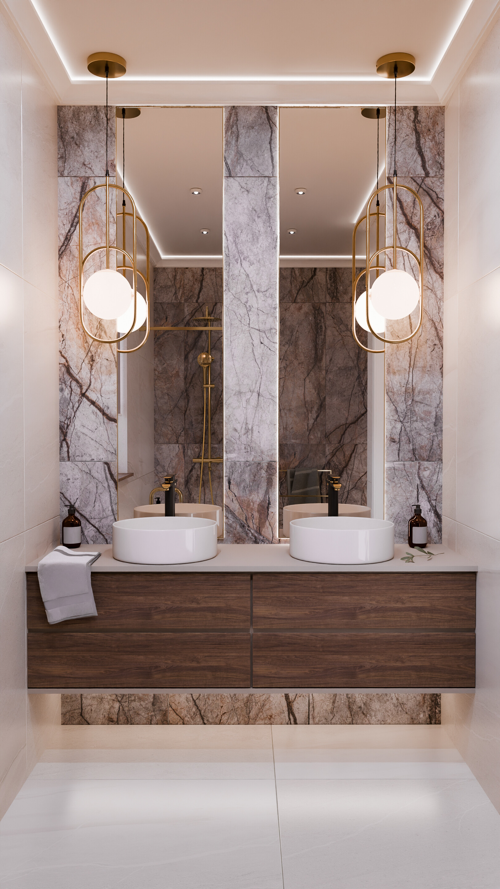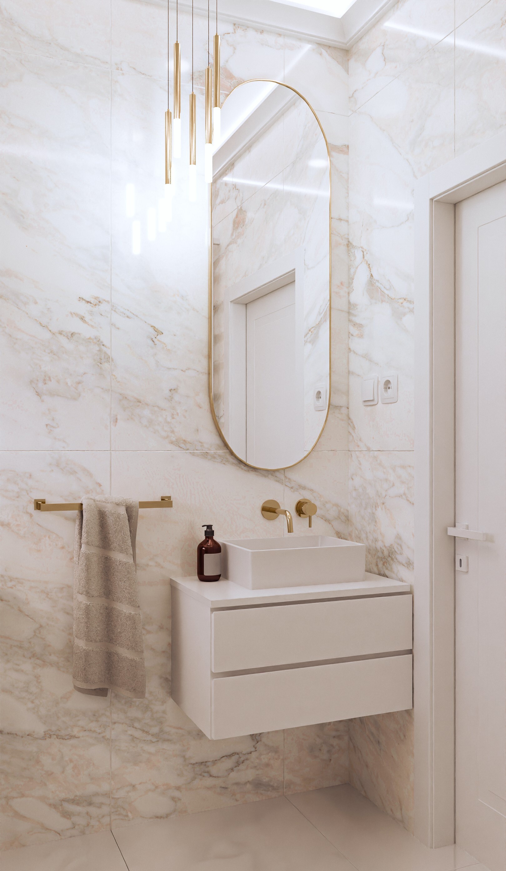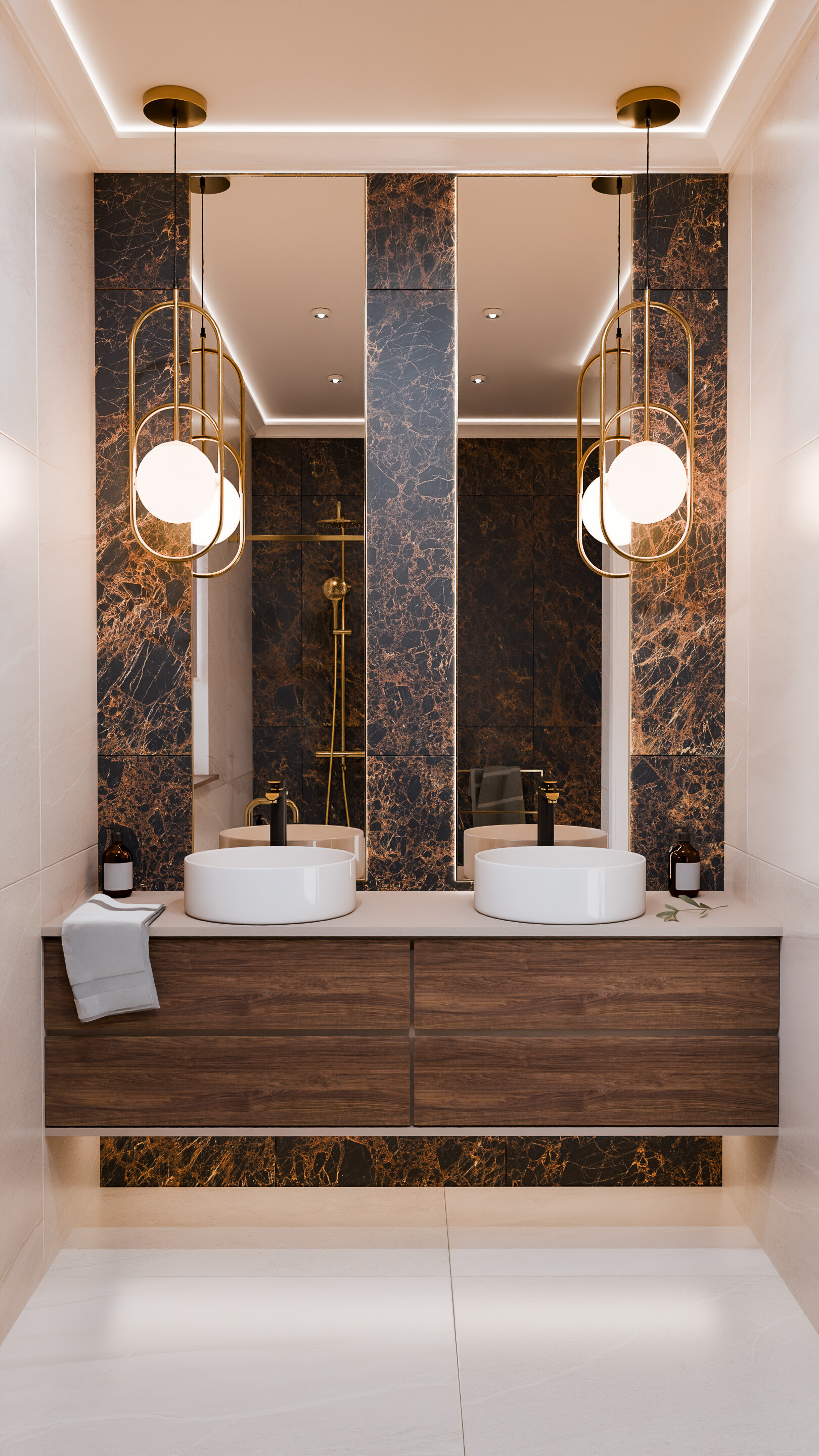 Projekt prezentuje nowoczesne, luksusowe wnętrza, w których dominują szlachetne materiały – marmur, złoto, naturalne drewno i miękkie tkaniny. Całość utrzymana jest w ciepłej, stonowanej palecie barw, tworząc harmonijną i przytulną przestrzeń.