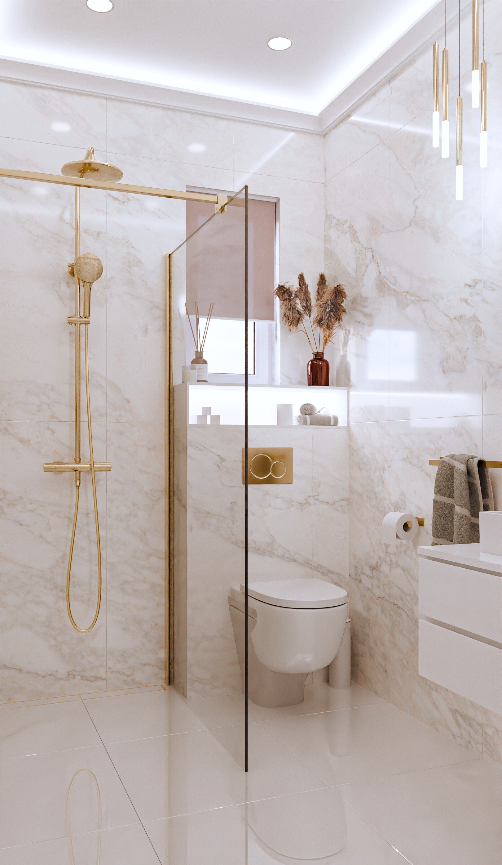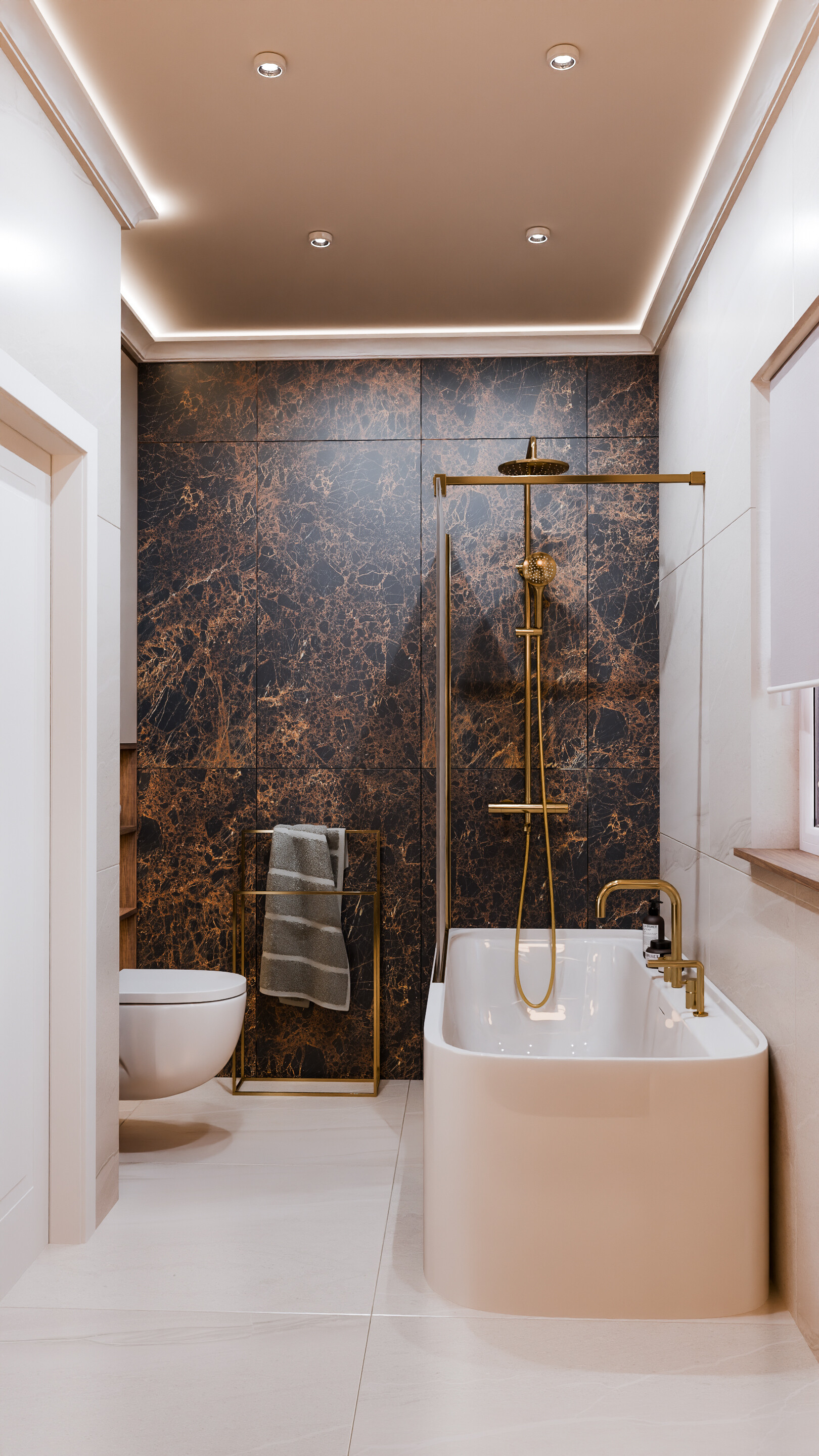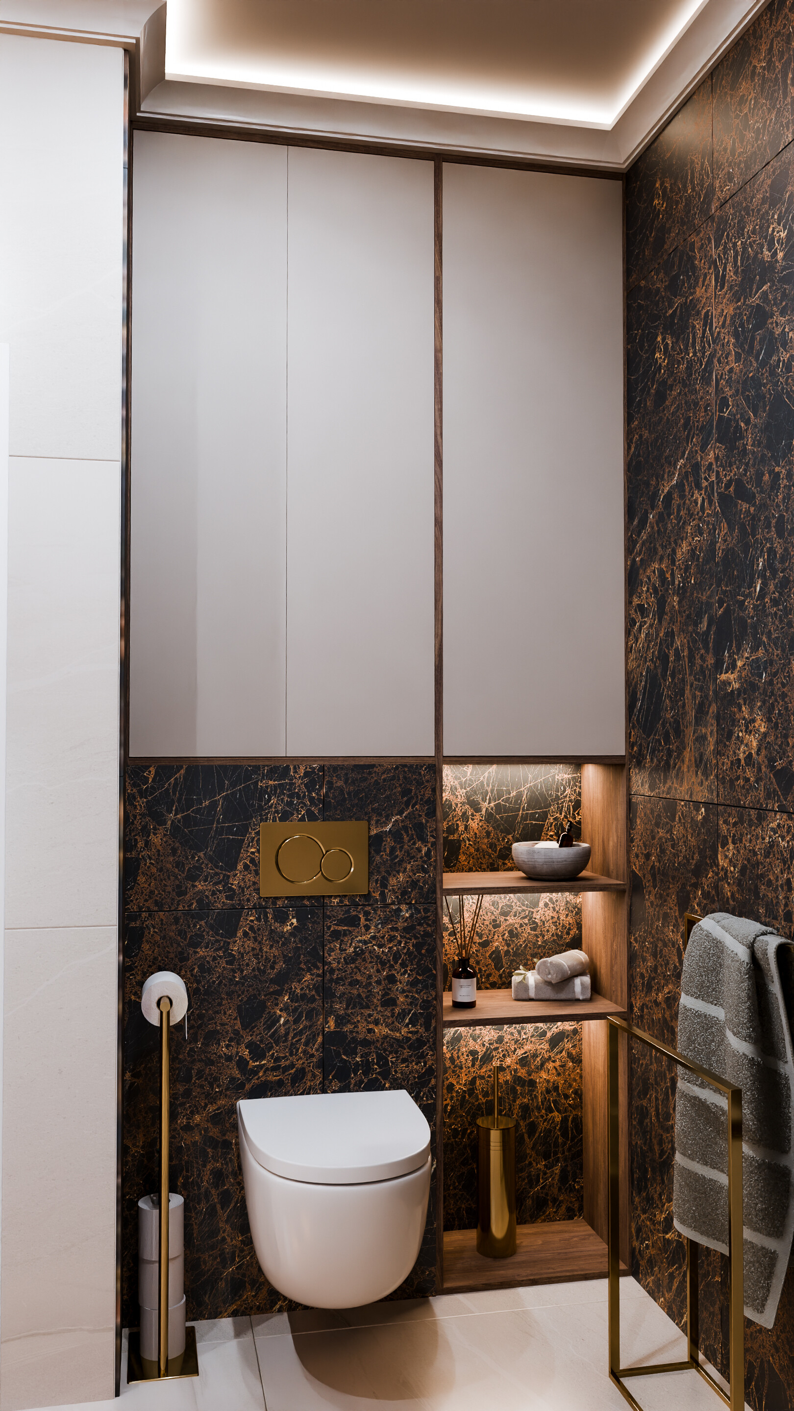 Projekt prezentuje nowoczesne, luksusowe wnętrza, w których dominują szlachetne materiały – marmur, złoto, naturalne drewno i miękkie tkaniny. Całość utrzymana jest w ciepłej, stonowanej palecie barw, tworząc harmonijną i przytulną przestrzeń.